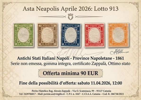 | La grande Asta NEAPOLIS n. 6 è online! Come recita la nostra locandina: “Stamps are art”. Asta NEAPOLIS n. 6: L’eccellenza Filatelica è online. Siamo lieti di annunciare l’apertura ufficiale del catalogo per la nostra sesta asta. In un mondo che corre veloce, la filatelia ci permette di fermare il tempo e possedere frammenti di storia universale. Perché partecipare all’Asta n. 6? Trasparenza totale: Siamo tra i pochi a offrire una video-analisi dettagliata per ogni collezione. Prestigio: Presenza garantita sulle migliori piattaforme internazionali, Bidinside e Philasearch. Qualità certificata: Pezzi rari selezionati con cura accademica. Esplorate il catalogo video: Non limitatevi alle foto. Entrate nei dettagli con i nostri video dedicati: https://www.youtube.com/@NeapolisAsteFilateliche Non perdete l’occasione di acquisire l’unico. |