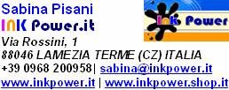 | IN TUTTA ITALIA: Ink Power S.r.l. ditta di distribuzione cartucce originali, compatibili e rigenerate. L´affidabilità dei prodotti Ink Power è garantita dalla qualità dei materiali utilizzati e dall´esperienza del nostro laboratorio dove le cartucce ink-jet e laser vengono ricostruite con competenza e professionalità. Ink Power è la risposta adeguata alla sempre crescente richiesta di un prodotto affidabile, ecologico ed economico. Ecco perché si propone come partner per l´apertura di un Negozio Ink Power in Franchising o, se hai già un tuo punto vendita, per la creazione di un Corner Ink Power. Con i prodotti Ink Power Risparmio e Rispetto per l´ambiente vanno di pari passo. Per info skype: sabinainkpower |