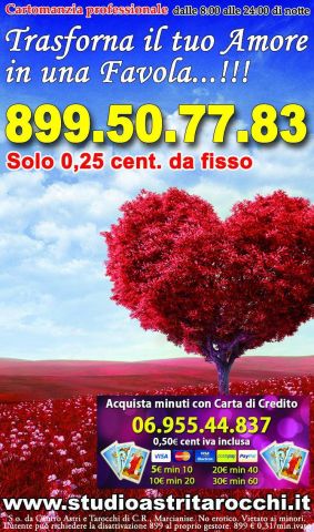 | www.studioastritarocchi.it Studio Astri tarocchi ti garantisce UN SERVIZIO DI CARTOMANZIA AL TELEFONO SERIO, PROFESSIONALE ED ECONOMICO. I nostri cartomanti sapranno essere per te coach di vita spirituale e sapranno ascoltarti e consigliarti conducendoti alla meta da te destinata per Karma. CARTOMANZIA AMORE, FORTUNA, LOTTO, INTERPRETAZIONE DEI SOGNI… per sapere se troverai la tua anima gemella. .. Mi ama ancora? Sarà matrimonio? Scopri cosa dicono le carte per te. Chiama il nostro studio di cartomanzia, astri e tarocchi. Richiedi un consulto di cartomanzia adesso alle nostre sensitive cartomanti. DA NOI TROVERAI IL MIGLIOR RAPPORTO QUALITA’PREZZO. Le nostre esperte con LETTURA TAROCCHI – SIBILLE – PENDOLO – LETTURA FOGLIE DI THE’ VERDE SAPRANNO INDIRIZZARTI E CONSIGLIARTI A BASSO COSTO SIA DA FISSO CHE DA CELLULARE. SCOPRI LA NOSTRO PROMO SULL’ ACQUISTO DEI MINUTI E A CONTI FATTI…. PIU’ ACQUISTI , PIU’ PARLI E PIU’ RISPARMI… 899.61.61.76 899.50.77.83. 899.88.10.56 oppure chiama su rete fissa acquistando con carta di credito o paypal 06.955.44.837 oppure 06.955.44.853 |